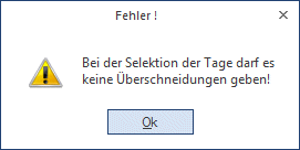 Bei der Angabe des Zeitraumes ist aber auch darauf zu achten, dass es keine Überschneidungen (Zeitraum wird doppelt definiert) gibt. Ist das der Fall, wird ebenfalls eine entsprechende Meldung ausgegeben.