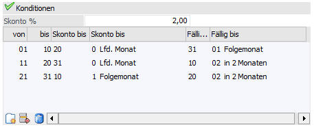 Hier wird eingegeben, bis wann der Skonto in Anspruch genommen werden kann, wobei im ersten Feld das Datum (z.B. 20 steht für den 20sten, 31 steht für den Letzten) und im zweiten Feld das Monat eingegeben wird. Bei der Angabe des Monats kann zwischen "Lfd. Monat", "Folgemonat" und in "2 Monaten" aus der Auswahllistbox gewählt werden.