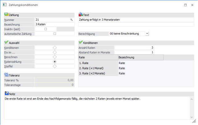 Bei allen 3 Raten wir die gleiche Zahlungskondition hinterlegt, die folgende Einstellungen hat: