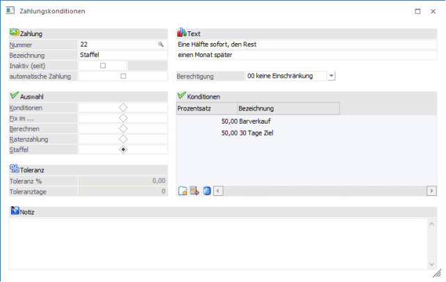 Bei der Staffelkondition gibt es die Möglichkeit, Fälligkeiten prozentuell aufzuteilen, z.B. die erste Hälfte fällig Sofort, die zweite Hälfte fällig nach 6 Monaten.