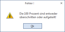 Es ist darauf zu achten, dass in dieser Tabelle keine Einträge mit irgendwelchen Prozenten ohne hinterlegter Zahlungskondition vorhanden sind. Außerdem muss die Summe der Prozentsätze 100 ergeben. Ist das nicht der Fall (> 100 oder < 100) wird eine entsprechende Fehlermeldung ausgegeben: