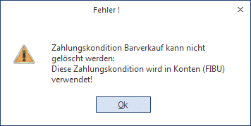 Durch Anklicken des LÖSCHEN-Buttons bzw. durch Drücken der Tastenkombination ALT+L wird der aktuelle Datensatz gelöscht. Dabei wird geprüft, ob die Zahlungskondition ggf. noch irgendwo in Verwendung ist. Ist das der Fall, wird eine entsprechende Meldung ausgegeben