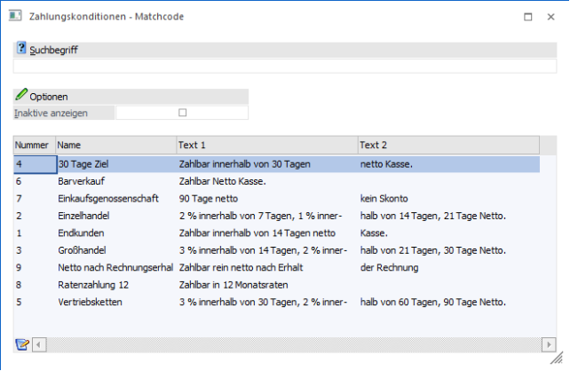 Nach Eingabe bzw. Übernahme des Suchbegriffs wird die Tabelle mit allen gefundenen Zahlungsarten gefüllt, wobei inaktive Zahlungskonditionen standardmäßig nicht angezeigt werden.