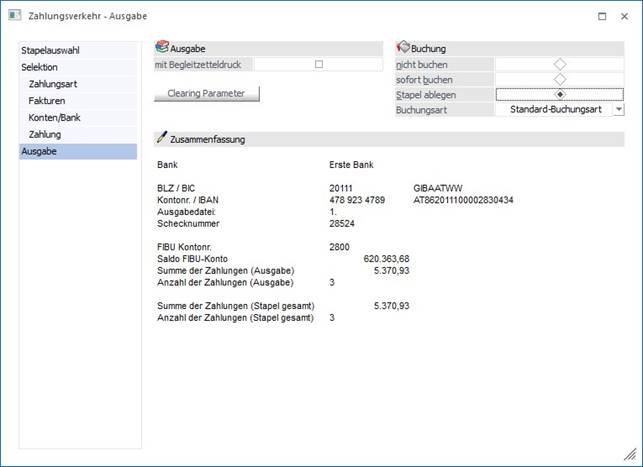 Mit dem Button 'Ausgabe Clearing' werden die Zahlungen durchgeführt - die Zahlungsdaten werden in eine Clearing-Datei ausgegeben.