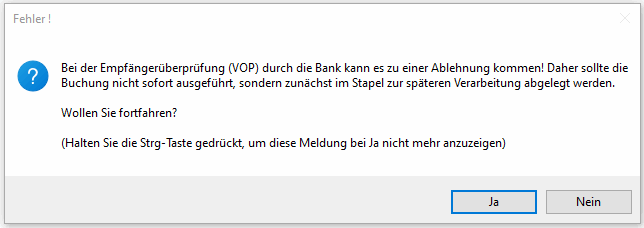 Wurde im Bankenstamm die Option "Empfängerprüfung - Prozesse optimieren" aktiviert und wird im Bereich Buchen "sofort buchen" aktiviert, kommt bei SEPA-Überweisungen für Österreich und Deutschland folgender Hinweis: