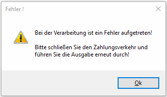Bei der Ausgabe im letzten Schritt des Zahlungsverkehrs und auch bei der Ausgabe der Zahlungsübersicht wird unabhängig vom Ausgabetyp geprüft, ob in der Tabelle eine Fakturennummer mehr als 1x vorkommt. Ist dies der Fall, wird die Verarbeitung mit einer Fehlermeldung abgebrochen.