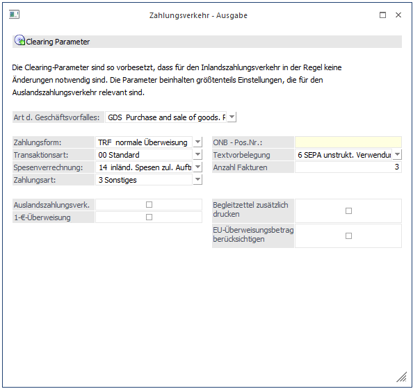 Textvorbelegung: Standard -> bedeutet in Österreich werden 11 Fakturen pro Überweisung übergeben.