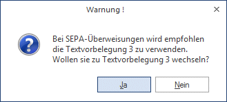 Für SEPA-Überweisungen gelten gewisse Texteinschränkungen beim Verwendungszweck. Bei der erstmaligen SEPA-Überweisung kommt im Zahlungsverkehr, wenn im Clearingparameter eine andere Textvorbelegung als "3" eingestellt ist, einmalig eine entsprechende Abfrage. Wird diese Abfrage mit JA beantwortet, wird automatisch die Textvorbelegung 3 im Clearingparameter eingetragen.