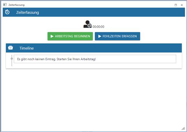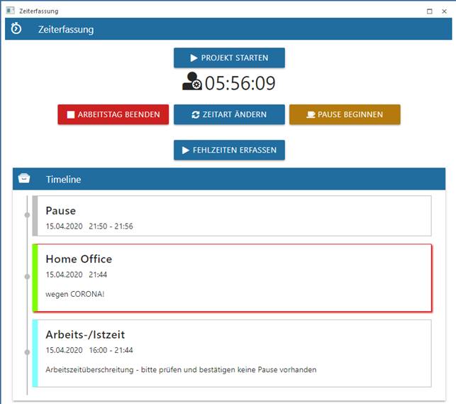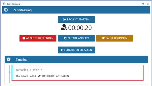Sobald der Arbeitstag begonnen wird stehen weitere Buttons für die Zeiterfassung zur Verfügung.