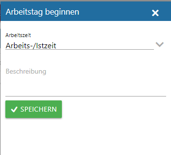 Mit dem Arbeitstag beginnen - Button wird der Arbeitstag gestartet. Sobald der Button gedrückt wird geht ein eigenes Fenster auf, wo die Istzeit aus der Auswahllistbox ausgewählt werden kann. In der Auswahllistbox stehen nur jene Zeitarten zur Verfügung, welche als Zeitarttyp "Istzeit" hinterlegt haben. Zusätzlich kann im Feld "Beschreibung" eine Notiz erfasst werden.