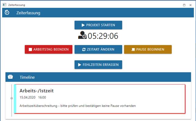Wenn eine Pause zu spät begonnen wurde oder fehlt, wird 6 Stunden nach dem Arbeitszeitbeginn eine Meldung ausgegeben.