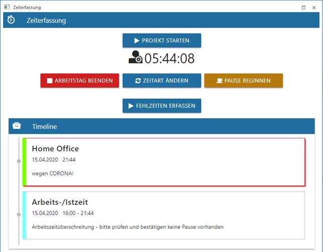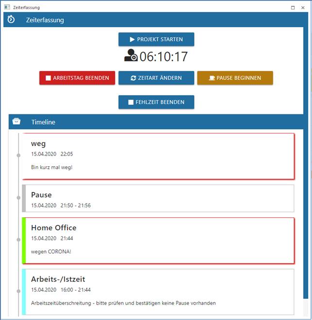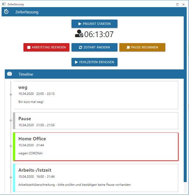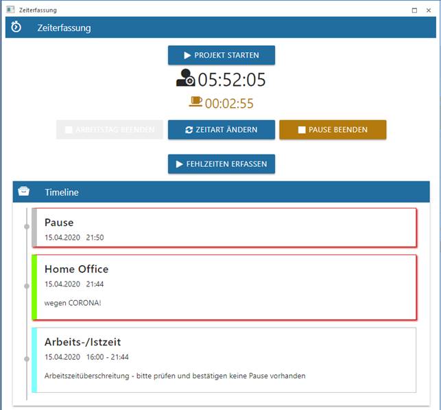 Die Timeline wird um den Eintrag Pause erweitert und die Pausendauer wird mit einen eigenen Pausenzähler gezählt. Die Zeitdauer bzw. die Arbeitszeitdauer werden weiter gezählt.