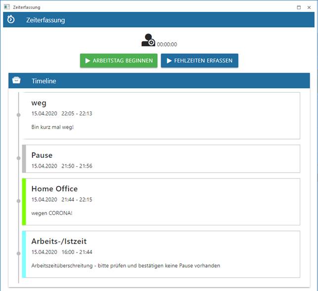 Sobald der Speichern-Button gedrückt wird, wird der Arbeitstag mit dem aktuellen Systemdatum und der aktuellen Systemuhrzeit gestartet.