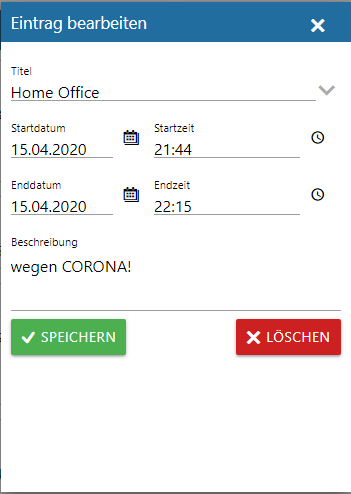 Im Menüpunkt "Zeiterfassung" können bestehende Zeiten bzw. Einträge editiert werden. Sobald in der Timeline auf einen Eintrag geklickt wird, geht ein eigenes Fenster auf, wo die Uhrzeiten und Daten entsprechend geändert werden können.