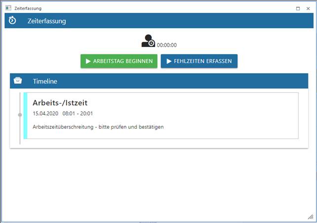 Es wird eine Hinweismeldung nach Überschreitung der Arbeitszeit ausgegeben.