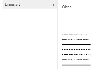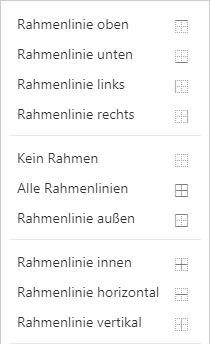 Über den Button "Rahmen" können Zellen mit einem Rahmen versehen werden. Wird der linke Bereich des Buttons angewählt, so wird der zuletzt gewählte Rahmen auf die Zelle bzw. den markierten Bereich angewendet. Wird hingegen der rechte Bereich gewählt, so öffnet sich ein Dialog, in welchem die Rahmenart, die Linienfarbe und die Linienart gewählt werden kann.
