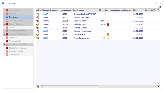In dem Programmbereich "Zuordnung" werden alle Ausprägungs- und Lagerortartikel des aktuellen Produktionsauftrags dargestellt und können u.a. ausgeprägt oder Lagerorten zugewiesen werden.