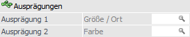 An dieser Stelle kann pro Ausprägungsgruppe (hier "Größe/Ort" und "Farbe") eine Ausprägung angegeben werden. Diese Vorbelegung wird beim Bestätigen der Eingabe direkt in die unausgeprägten Ausprägungszeilen übernommen.