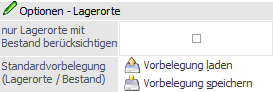 Mit Hilfe der Buttons "Vorbelegung laden" und "Vorbelegung speichern" kann die aktuelle Lagerortvorgabe, sowie die Option "nur Lagerorte mit Bestand berücksichtigten", benutzerspezifisch geladen bzw. gespeichert werden.