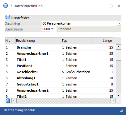 Sollte sich ein Benutzer in einem Menüpunkt der WinLine FIBU bzw. der WinLine FAKT oder in der Vorlagenanlage bzw. dem Fenster "Kampagnen" befinden, so wird die Zusatzfelddefinition in einem "Lesemodus" geöffnet, d.h. es können die bestehenden Zusatzfelder kontrolliert, Änderungen allerdings nicht durchgeführt werden. Hierfür muss zunächst mit Hilfe des Buttons "Bearbeiten" der "Bearbeitungsmodus" aktiviert werden, wobei die oben erwähnten Bereiche zuvor verlassen werden müssen. Über den aktuellen Modus wird jederzeit in der Statusleiste Auskunft gegeben.