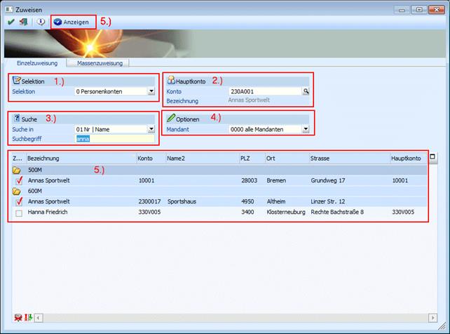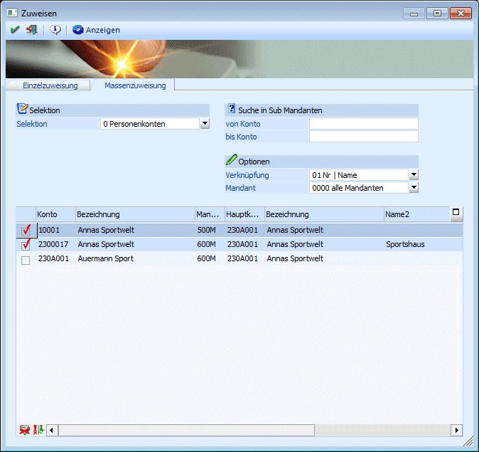Über Massenzuweisung werden nur die Daten herangezogen, deren Nummer, Bezeichnung oder andere unten angeführte Kriterien tatsächlich mit denen aus dem Konto im Hauptmandanten übereinstimmt. Dabei stehen die gleichen Optionen, wie bei der Einzelzuweisung zur Verfügung.