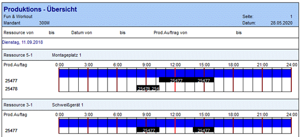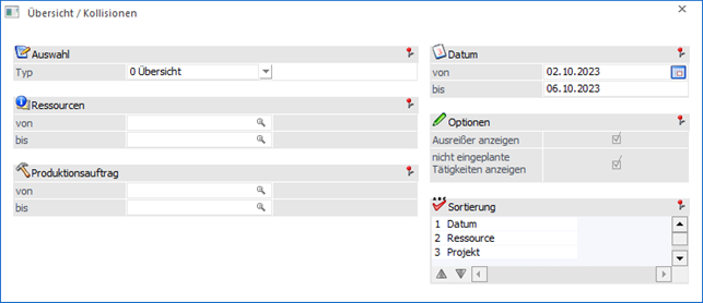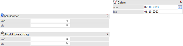 Kriterien "Datum", "Ressource" und "Projekt" (Produktionsauftrag) zur