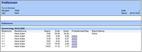 Der Facharbeiter Hans Huber wurde am 28.05.2020 für den Produktionsauftrag 25525 reserviert. Nachträglich wurde in der Fehlzeitenerfassung eingetragen, dass Hans Huber an diesem Tag im Krankenstand ist. Dadurch entsteht an diesem Tag eine Kollision für die Ressource Hans Huber.